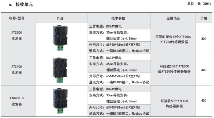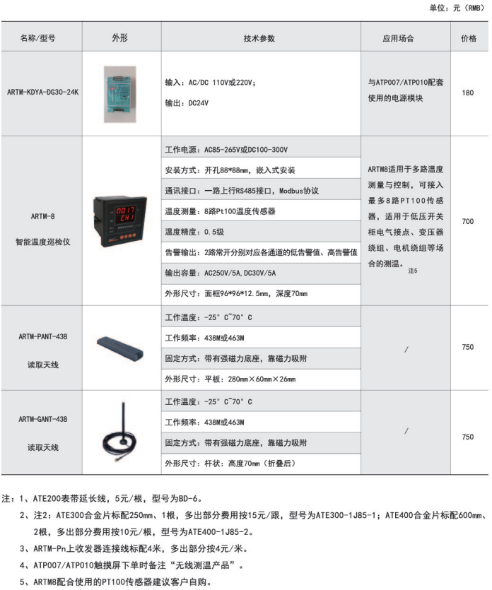 ARTM-Pn無線測溫裝置:ARTM-Pn無線測溫裝置可以單獨安裝在高壓柜、低壓抽屜柜內(nèi),每臺裝置可以接收18個傳感器的數(shù)據(jù),傳感器型號可選配ATE100、ATE200、ATE300。裝置帶有一路485接口,可將采集到的溫度數(shù)據(jù)上傳到監(jiān)控中心。應用范圍: