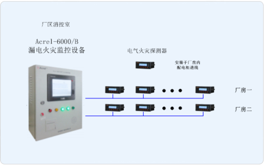 本項目針對其6萬噸年MTBE裝置原料預處理裝置所在廠房的配電系統設計一套電氣火災監控系統。通過實時監測廠房內的重要配電箱的進線回路,實時監測其漏電流的大小以及溫度等參量,通過限制預警,增強管理人員的電氣火災隱患防范意識,提高電氣火災隱患的排查效率,確保廠房內的生產安全。
