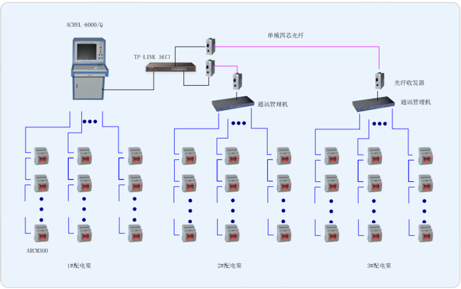 系統組網共分為站控管理層、網絡通訊層、現場設備層三層,該項目通訊總線共接入20條通訊總線,總線在樓層配電箱手拉手串接后,接入Acrel-6000/Q電氣火災監控設備,組成電氣火災系統的大動脈。箱體中漏電流互感器通過電流線接入漏電探測器,漏電探測器實時顯示漏電情況,組成一套信號穩定,精度可靠的電氣火災監測系統。現場共有449只ARCM系列電氣火災探測器模塊。