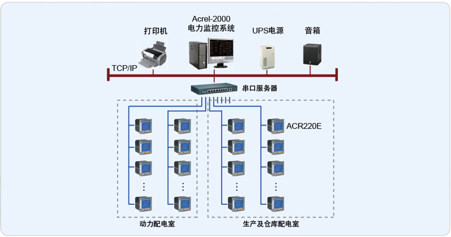 安科瑞電氣股份有限公司于2013年3月承接了杭州賽諾菲民生健康藥電力監(jiān)控系統(tǒng)項(xiàng)目。整個(gè)系統(tǒng)采用Acrel-2000型電力監(jiān)控系統(tǒng),完成了杭州賽諾菲民生健康藥業(yè)有限公司共有2個(gè)配電室(動(dòng)力中心配電室、生產(chǎn)廠房及倉(cāng)庫(kù)配電室)電力監(jiān)控。動(dòng)力中心配電室內(nèi)有2臺(tái)進(jìn)線柜、1臺(tái)母聯(lián)柜、4臺(tái)補(bǔ)償柜及24路普通饋線回路;生產(chǎn)及倉(cāng)庫(kù)配電室內(nèi)有2臺(tái)進(jìn)線柜、1臺(tái)母聯(lián)柜、4臺(tái)補(bǔ)償柜及43路普通饋線回路,整個(gè)監(jiān)控范圍為81個(gè)回路的電參量監(jiān)測(cè),每個(gè)回路均采用安科瑞ACR220E型多功能儀表。網(wǎng)絡(luò)儀表均采用RS485接口和MODBUS-RTU通訊協(xié)議,RS485采用屏蔽線傳輸,上傳至監(jiān)控主機(jī)。