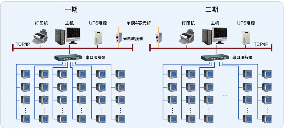 一期配電房由兩個(gè)相互獨(dú)立的配電房組成,動(dòng)力中心配電房包含主室和次室,次室距主室的約30米。其中Acrel-2000電力監(jiān)控系統(tǒng)在動(dòng)力中心配電室的次室里。動(dòng)力中心配電房有2臺(tái)變壓器(1#變壓器、2#變壓器),共有57臺(tái)ACR120EL;現(xiàn)場(chǎng)采用4根屏蔽雙絞總線連接。生產(chǎn)車(chē)間配電房中有2臺(tái)變壓器(3#變壓器、4#變壓器),共有39臺(tái)智能儀表,現(xiàn)場(chǎng)采用2根RS485總線上傳至主機(jī)。