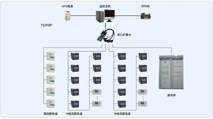整個(gè)系統(tǒng)采用分布式結(jié)構(gòu),高壓配電室、低壓配電室1#、低壓配電室2#內(nèi)現(xiàn)場(chǎng)設(shè)備均采用RS485總線(xiàn)直接接入監(jiān)控主機(jī)擴(kuò)展卡的串口。對(duì)于每個(gè)回路采用ACR多功能儀表,共126個(gè)回路;站控層應(yīng)用國(guó)內(nèi)知名的聯(lián)想商用計(jì)算機(jī)作為監(jiān)控主機(jī),同時(shí)設(shè)有用于報(bào)表打印輸出的打印機(jī);防止異常斷電而引發(fā)的數(shù)據(jù)丟失的UPS設(shè)備。監(jiān)控軟件平臺(tái)采用單機(jī)版Acrel-3000型電能管理系統(tǒng)。Acrel-3000型電能管理系統(tǒng)預(yù)留了擴(kuò)展接口,可方便進(jìn)行擴(kuò)展。