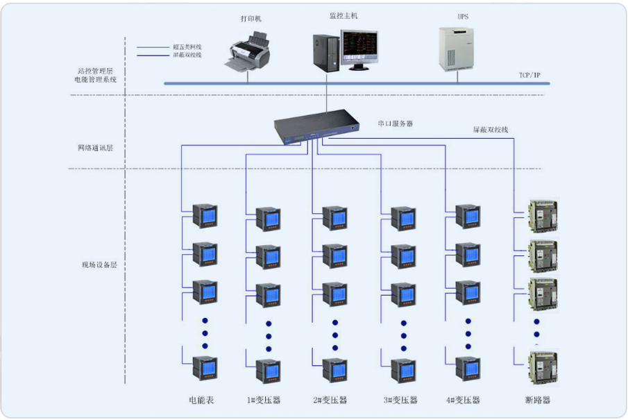 安科瑞電氣股份有限公司于2014年承接該項目電力監控系統,系統通過多功能的電力監控裝置、通訊網絡和計算機軟件,實現工廠內供配電系統在運行過程中的數據采集、運行監視、事故預警、事故記錄和分析、電能質量檢測、三相不平衡監視、繼電保護等,完成工廠的安全供電、用電管理、設備管理和運行管理。系統由主控層、通訊管理層和現場控制層構成。系統要求盡量減少集中采集數據的裝置以保證系統的通訊可靠性。本次項目主要涉及當陽市蒙牛乳業有限責任公司配電室內的網絡多功能儀表、電能表以及斷路器,53個回路需要監測,監控主機位于配電室。