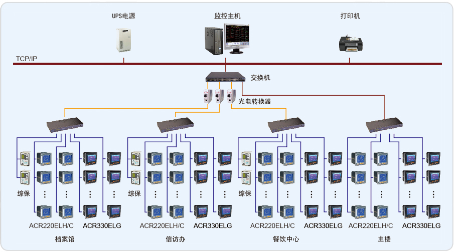 該項(xiàng)目采用Acrel-2000電力監(jiān)控系統(tǒng)實(shí)現(xiàn)了海門行政中心4座樓內(nèi)(主 樓、A樓、B樓、H樓)電力系統(tǒng)的智能管理。項(xiàng)目值班室位于主樓負(fù)一層變配電室內(nèi),主樓變配電室主要設(shè)備是:ACR220EL/KC、ACR330EL/KC可編程智能電測(cè)表共96塊,配置一臺(tái)工業(yè)網(wǎng)絡(luò)交換機(jī);A樓變配電室主要設(shè)備是:ACR220EL/KC可編程智能電測(cè)表共63塊,現(xiàn)場(chǎng)采用8根總線,使用一臺(tái)8口的串口服務(wù)器,通過光纖連接至主樓值班室內(nèi)的交換機(jī)上;B樓變配電室主要設(shè)備是:ACR220EL/KC可編程智能電測(cè)表共59塊,現(xiàn)場(chǎng)采用6根總線,使用一臺(tái)8口的串口服務(wù)器,通過光纖連接至主樓值班室內(nèi)的交換機(jī)上;H樓變配電室主要設(shè)備是:ACR220EL/KC可編程智能電測(cè)表共105塊,采用5根總線,使用一臺(tái)8口的串口服務(wù)器,通過光纖連接至主樓值班室內(nèi)的交換機(jī)上;再通過交換機(jī)把數(shù)據(jù)傳輸?shù)焦た貦C(jī)。上述設(shè)備均相互獨(dú)立完成各自的功能,不依賴主控計(jì)算機(jī)運(yùn)行,具備RS-485 通信接口,通過現(xiàn)場(chǎng)的RS-485總線將檢測(cè)到的各項(xiàng)電參數(shù)和狀態(tài)信號(hào)實(shí)時(shí)傳輸?shù)街虚g層的數(shù)據(jù)處理單元—串口服務(wù)器。