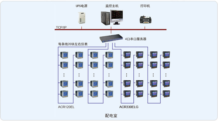 整個(gè)系統(tǒng)采用網(wǎng)絡(luò)分布式結(jié)構(gòu),監(jiān)控主機(jī)位于地下一層變電所值班室內(nèi),配電柜內(nèi)安裝有本公司ACR330ELH、ACR120EL儀表共計(jì)60多回路。仁恒河濱花園電力監(jiān)控系統(tǒng)現(xiàn)場(chǎng)共1個(gè)低壓配電室,配電室內(nèi)采用安科瑞ACR系列電力監(jiān)控儀表采集各回路的電流、電壓、電能等電參量,然后通過(guò)中間層采集設(shè)備網(wǎng)線到監(jiān)控室計(jì)算機(jī)上,實(shí)現(xiàn)遙測(cè)、遙信功能。