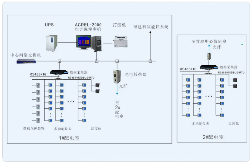 系統采用Acrel-2000型電力監控系統,監控主機位于1#配電室內電力監控值班室,2#配電房距離值班室較遠,通過通訊管理機將采集的數據經處理后經光纖收發器和光纜上傳至位于1#配電室內電力監控值班室;所有配電回路均配備安科瑞電力儀表ACR系。該項目實現了13號地塊電力系統的智能管理。所有監控設備均通過屏蔽雙絞線至各自配電室內的通訊管理機,再通過光電轉換器經過光纖將數據傳輸至1#配電室內電力監控值班室,從而實現遠程監控。