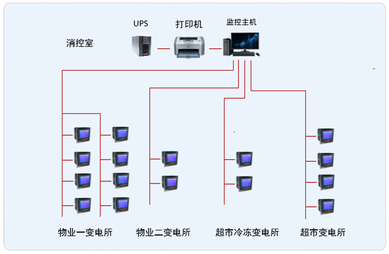 系統采用Acrel-2000型電力監控系統,整個系統采用網絡分布式結構,監控主機位于消防監控室中,其他4個配電室分別位于地下一層。該項目實現了湖州萬達4個10kV變電所的智能管理。所有監控設備均通過屏蔽雙絞線至后臺監控主機,從而實現遠程監控。