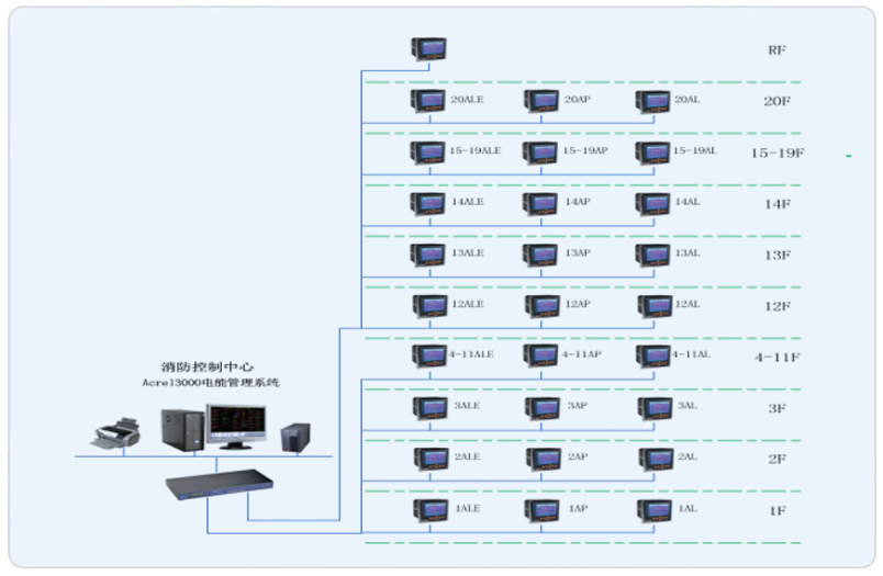 我司本項目承接其樓層部分電能管理系統搭建,完成對配電回路用電的實時監控和管理。該項目進出線回路均采用ACR多功能液晶顯示儀表,其是針對電力系統、公共設施、智能大廈的電力監控需求而設計的網絡電力儀表,它能測量所有常規電力參數,如:三相電壓、電流、有功功率、無功功率、功率因數、頻率、有功電度、無功電度。現場儀表以手拉手方式通過屏蔽雙絞線(RVVSP2*1.0)進行通訊連接,每根總線連接智能儀表數量在20只左右,不同種類的智能裝置連接在不同的總線上,然后將數據上傳至數據采集器,進而將數據上傳至當地監控終端。