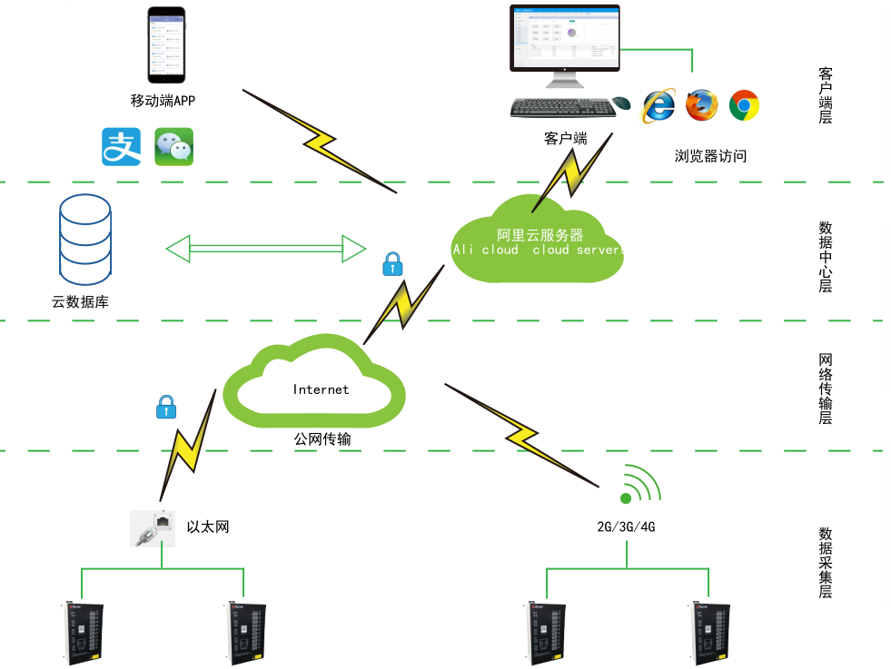 安科瑞電瓶車充電樁通過GPRS模塊與云端進行通信和數據交互。系統能夠對電瓶車充電樁的日常狀態、充電過程進行監控;實現充電支付對接:支持投幣、刷卡、微信支付等多種支付方式,保證支付交易過程的完整性,對充電過程中的異常情況進行有效預警;實現對下游站級平臺的清算、對賬功能。